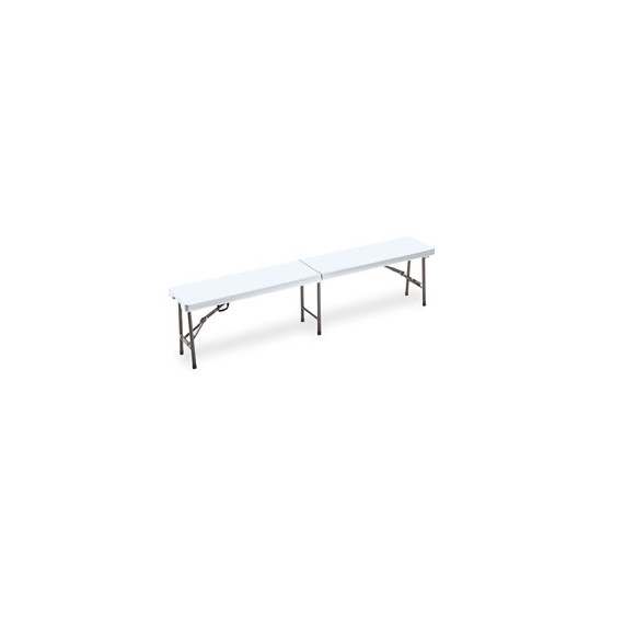 Panca HORECA rettangolare pieghevole di colore bianco. Struttura in acciaio verniciato con vernici epossidiche color grigio e top in HDPE di colore bianco pieghevole. Dimensioni: H44 x P30 x L183cm - 8,6kg.Articolo destinato ad esclusivo uso domestico. Non adatto ad uso pubblico.
