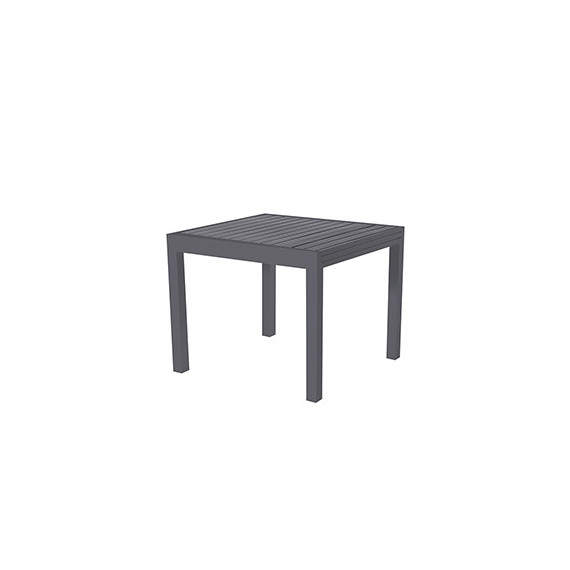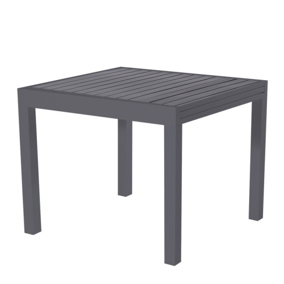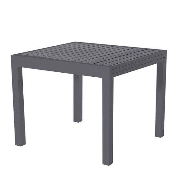 Tavolo allungabile in alluminio verniciato con top a doghe. Apertura a scorrimento. Articolo da montare. Abbinabile alle sedute sardegna: cod 105628 105629. Dimensioni: 90-180 x90 x74cm