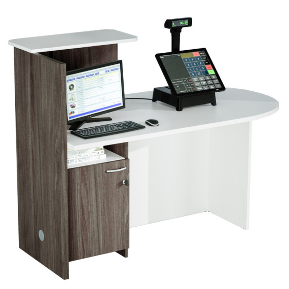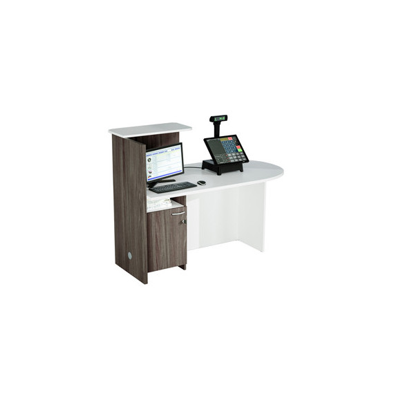 Reception ideale come postazione cassa in negozi, centri estetici ecc. o come reception in ambulatori, cliniche e ovunque sia necessaria una postazione di ricevimento confortevole ma compatta. Dotata di bancone con piano sagomato a DESTRA 140x83xH73,3cm (sp. 25 mm). Mensola superiore 64x30cm sp. 18mm (H42cm dal piano). Due ripiani L38,2cm sotto il desktop. Fianco (sp. 25mm) con foro passacavi in corrispondenza del ripiano inferiore. Bicolore bianco/frassino toscano.