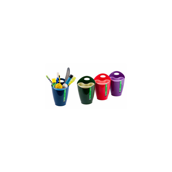 Portapenne multiscomparto composto da 2 bicchieri utilizzabili uno dentro l'atro oppure separatamente. Dimensioni: diametro 8cm - H 17cm. In confezione assortita nei colori blu, verde, rosso e viola.