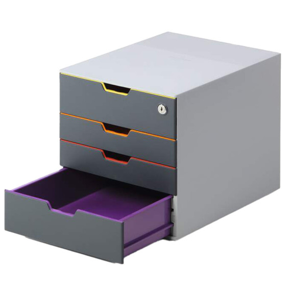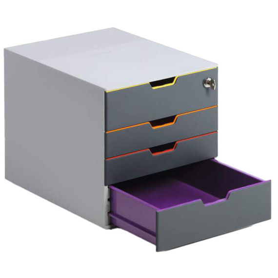 Cassettiera da scrivania con 4 cassetti, due ad alta capacità di cui quello superiore dotato di serratura. Ideale per riporre documenti sia f.to A4 che f.to C4 (fino a 24 x 32 cm). Realizzata con materiali di alta qualità che la rendono solida, robusta e durevole nel tempo. È caratterizzata da un design ricercato e moderno e dai cassetti con profilo e interno colorato che offrono un supporto intuitivo per la catalogazione dei documenti e per l'organizzazione dell'ufficio. I cassetti possono essere rimossi e riposizionati secondo l'ordine di colori desiderato. Cassetti a scorrimento fluido e silenzioso, dotati di blocco di fine corsa che ne evita la fuoriuscita accidentale durante l'apertura. Nel fondo dei due cassetti più piccoli c'è una fessura che agevola il recupero dei fogli inseriti, mentre sul frontalino è presente un porta-etichetta rimovibile con cartoncino personalizzabile.Possono essere impilate e affiancate rimanendo perfettamente stabili grazie ai piedini antiscivolo di cui sono dotate. Cassetto superiore e cassetto inferiore formato XXL - maxi capacità. Colore cassetti: giallo, arancio, rosso e viola. Dimensioni: 280 x 292 x 356 mm (LxHxP).