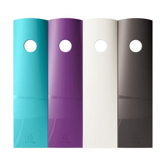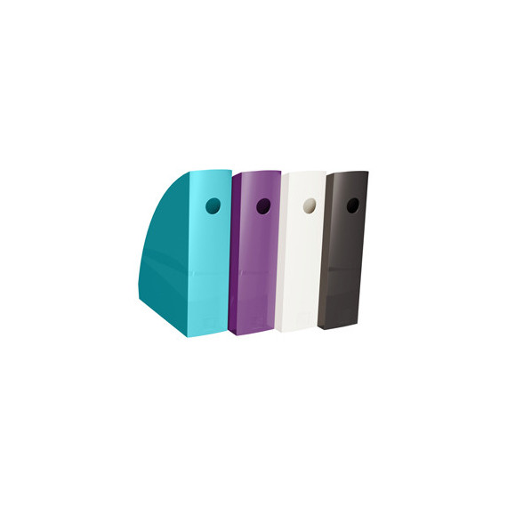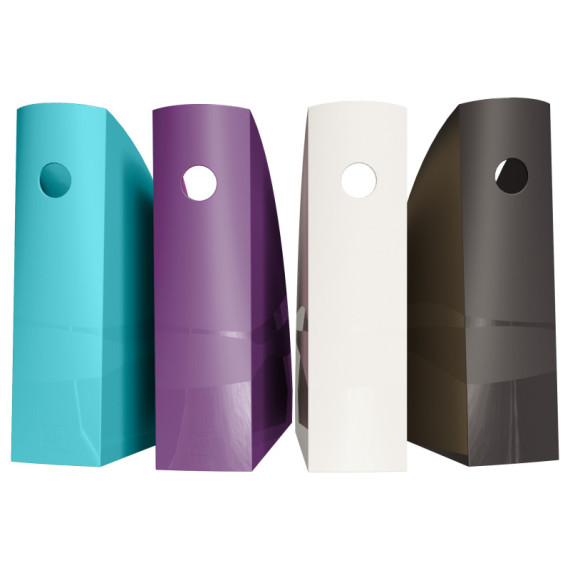 Materiale PS riciclato Dorso 82mm Occhiello di presa Dimensioni : 266x82x305 mm Colori assortiti : melanzana, nero, cocco, turchese Certificazione Blue Angel Garanzia : 25 anni