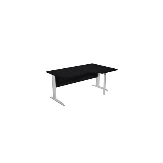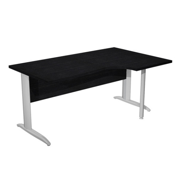 Scrivania compact destro sagomata con fianchi metal ad L verniciati effetto cromato. Spessore 22mm. Completi di canalina passacavi e piedini regolabili in altezza e supporto metal. Desktop con bordo anti urto in ABS da 2mm. Dimensioni: 160x60/80/100x72cm. Piano nero venato frassino.