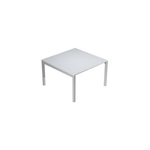 Tavolo riunioni con piano 120 x 120 cm, in spessore 25 mm, con assenza di spigoli vivi, bordato in abs sp.2 mm. Realizzato in materiale melaminico, classe E1, con finitura antigraffio e antiriflesso. Struttura in metallo, con solida gamba di sezione 50x50 mm. in finitura grigio alluminio. Piano dotato di ampio passacavi rettangolare centrale.