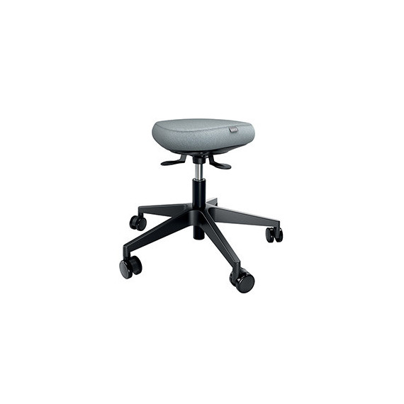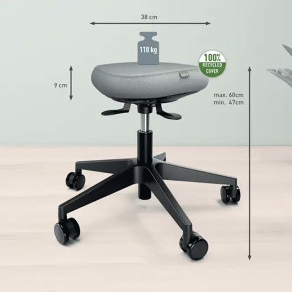 Sgabello attivo con ruote dotato di seduta oscillante a 360°, La seduta e dotata di un’imbottitura Dual Density Foam (DDF) spessa 9 cm, con uno strato interno rigido per il supporto e uno strato esterno morbido per il comfort. Favorisce una postura corretta e riduce la pressione sulle gambe. Rivestimento 100% in materiale riciclato.