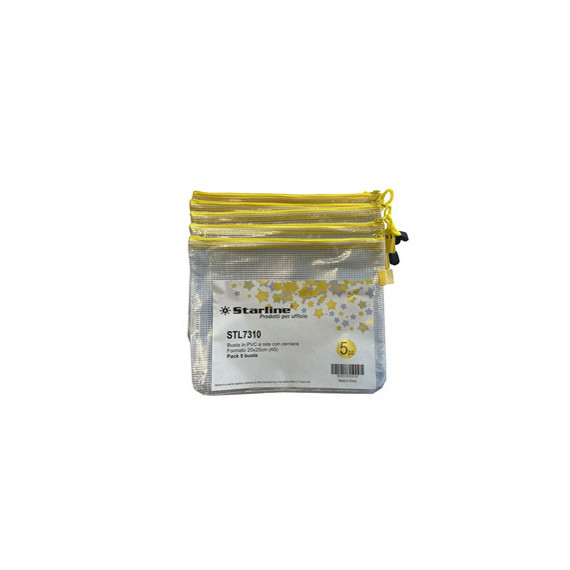Busta STARLINE in robusto PVC a rete con cerniera di colore giallo. Ideale per documenti e piccoli oggetti.Caratteristiche di questo prodotto:Codice: STL7310Tipologia di prodotto: Buste con cerniera per vari utilizziFormato utile: A5Formato esterno: 20x25cmSpessore: 0,30mmResistenza alla trazione: =>350g/m2Confezione da 5 buste