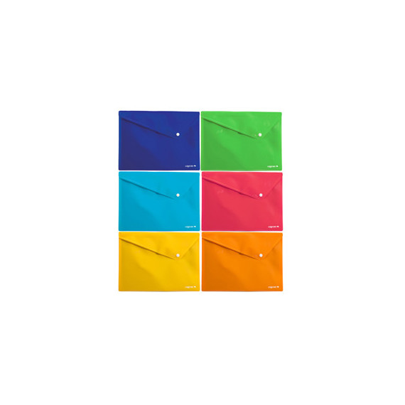 Buste orizzontali in PP con chiusura a bottone e angoli arrotondati. 6 colori assortiti.