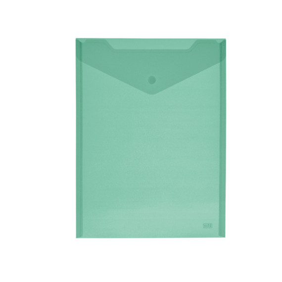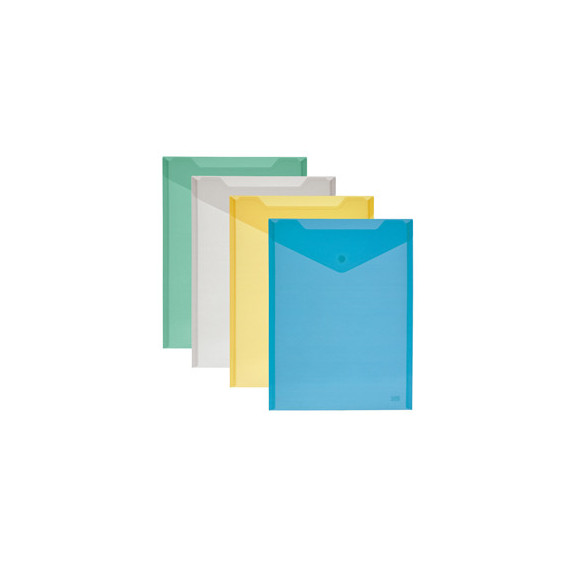 Buste in polipropilene con chiusura a bottone. Confezione assortita in 4 colori. Formato utile: 23,5x32cm.