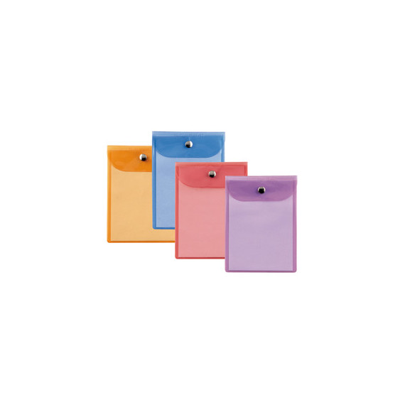 Buste in PVC colorato, alto spessore, con patella e bottone di chiusura in metallo. Ideali per istruzioni, documenti, campioni, certificati di garanzia, monete, disegni, agende. Formato contenuto: 130x180 mm. Assortimento colori: lilla, rosa, azzurro, arancio .