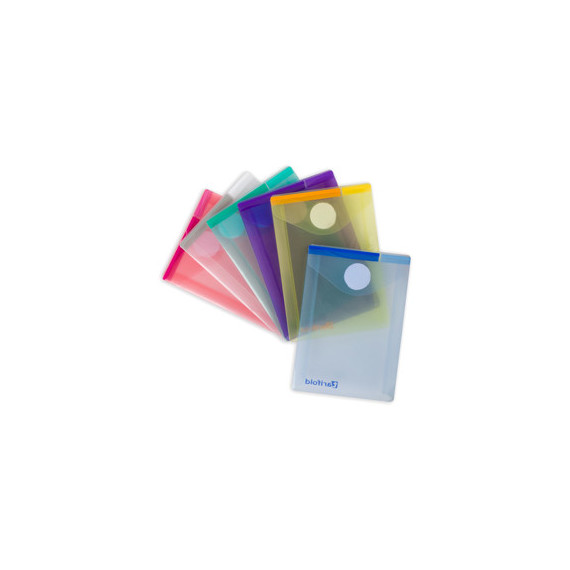 Buste in PPL con chiusura in velcro. Colori trasparente opaco in confezione da 6 colori assortiti. Dimensioni 8x11,5cm (contiene formato A7).