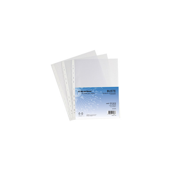 Buste STARLINE con foratura universale rinforzata. Realizzate in polipropilene trasparente finitura a buccia d'arancio antiriflesso. Formato utile 22x30cm. Caratteristiche di questo articolo: Modello: Busta trasparente a foratura universale in PP Tipologia di spessore: medium Formato utile: 22x30cm Finitura: buccia antiriflesso Foratura: universale Confezione: 50 buste