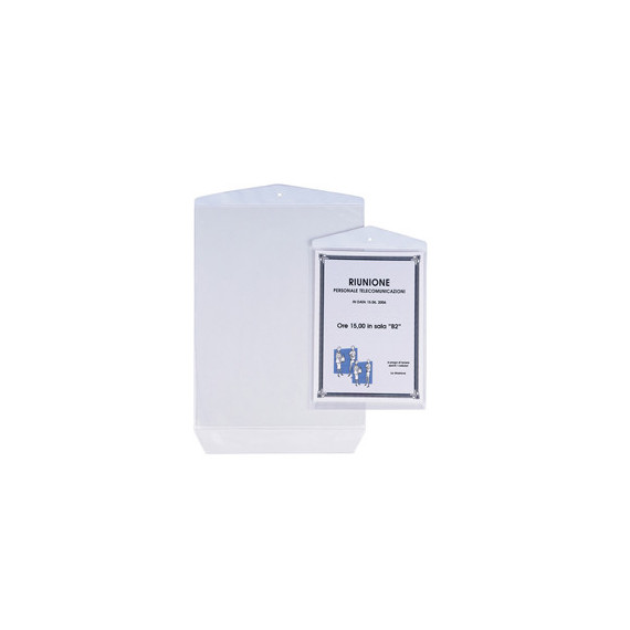 Buste porta avvisi in PVC con foro rinforzato per appendere e patella di chiusura dal basso. Ideali per proteggere dalla polvere e dall'umidità, istruzioni, avvisi, tabelle, licenze, menu, informazioni pubbliche.Formato contenuto 230x330 mm.