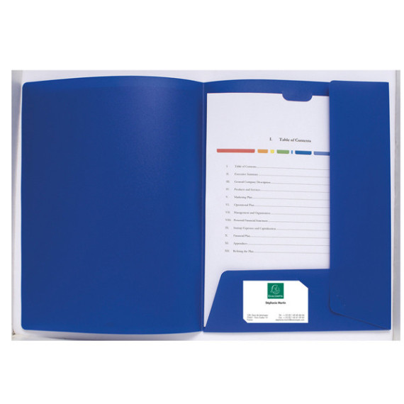 Copertina morbida con busta A4 trasparente per la personalizzazione. Spazio un biglietto da visita nell'intaglio in basso della cartella. Assortito in 4 colori: Bianco - Blu - Nero - Rosso. F.to esterno 24x32cm.