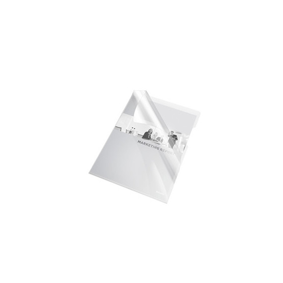 Cartelline a L in PVC extra lucido trasparente rigido. Ampia lunetta per facilitare l'apertura. Formato utile: 21x29,7cm. Finitura liscia. Confezione da 25 buste.
