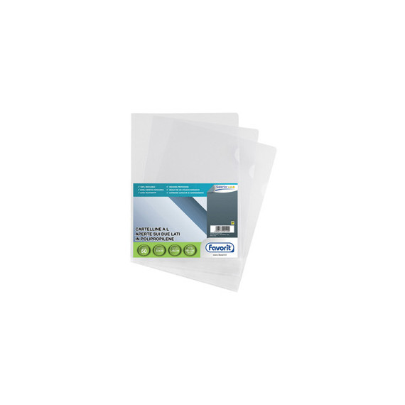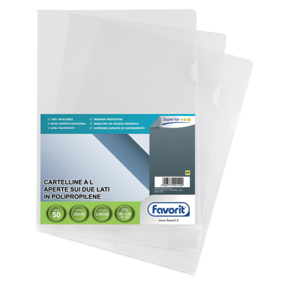 Cartelline a L trasparente liscio in polipropilene con lunetta per facilitare l'apertura. Formato utile: 22x30cm. Confezione da 50 cartelline. Made in Italy