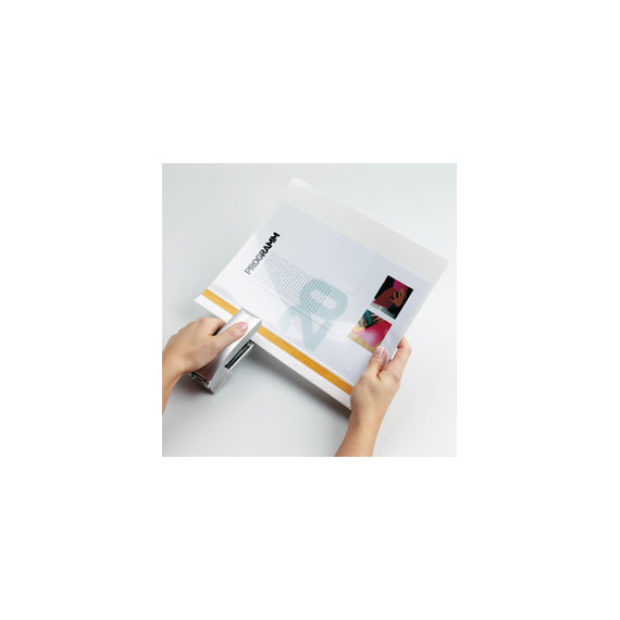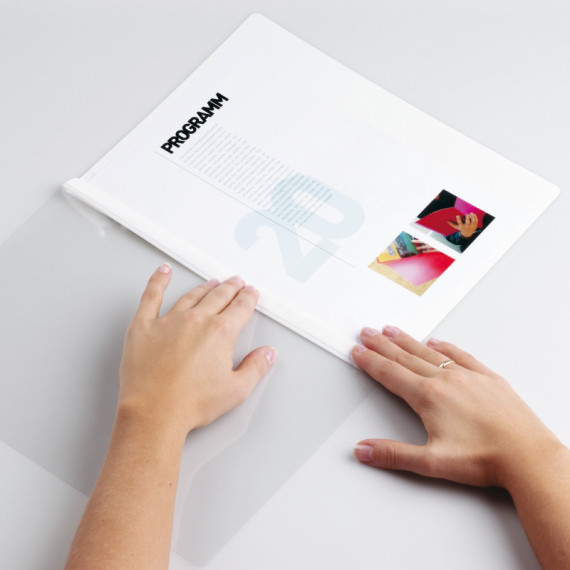 Cartelline bianche per rilegatura rapida mediante punti metallici. In PVC con copertina frontale trasparente e posteriore colorata. I punti vengono coperti dalla banda adesiva colorata posta su ambo i lati della cartellina. Dotate inoltre di asole per l'archiviazione in raccoglitori ad anelli. Capacità 1-30 fogli A4. Formato utile: 21x29,7cm.