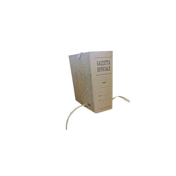 Cartella archivio con 3 legacci incollati per gazzetta ufficiale. Realizzate in cartone rivestito con carta litografata iuta. Legacci a fettuccia fortemente fissati con collante. Formato 31x22cm. Dorso 10cm. Confezione da 25 faldoni.