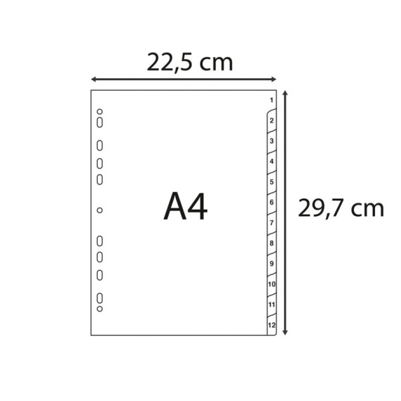 MARCHIO : ExacomptaMATERIALE : PplSPESSORE : 12/100ECOLORI : GrigioFORMATO ESTERNO : 22,5x29,7 cmFORMATO : A4TIPO DI PRODOTTO : IntercalariTIPO : NumericoNUMERO POSIZIONI : 12