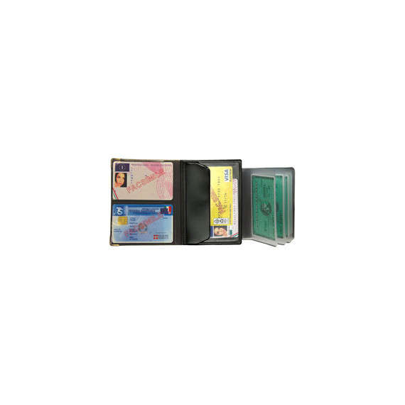 Portadocumenti multiplo. Copertina in pvc espanso sergé e similpelle spessore 1,3 mm, angoli in metallo finitura nichel, inserto fly portabanconote e 2 card, scomparti per documenti formato card e inserto a libretto per 5 card in pvc antistatico.