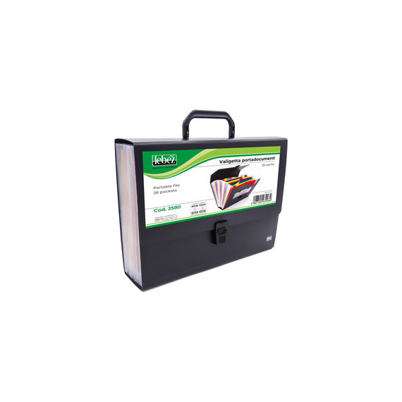 Cartella in robusto polipropilene e di grande capacità. Dotata di 25 tasche colorate e di tasca frontale porta biglietti da visita. Dimensioni: 33x24,5x8cm. Colore nero.