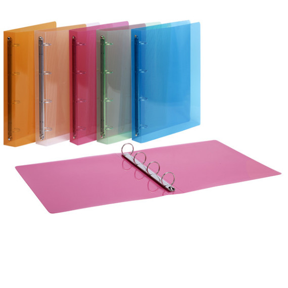 Realizzati in polipropilene colorato con speciale finitura rigata. Disponibili in 5 colori: arancio, fucsia, verde, azzurro e neutro. Formato interno 22x30cm. Dotati di meccanismo a 4 anelli tondi con Ø15mm e Ø30 mm. Made in Italy.