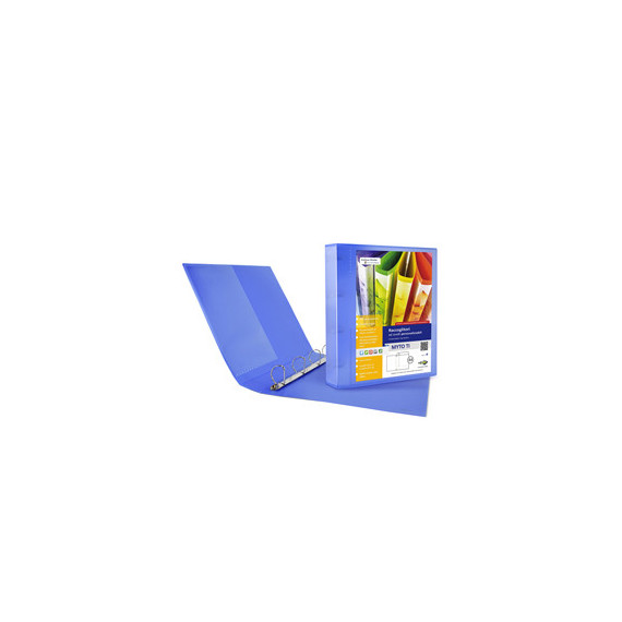 Raccoglitore personalizzabile in polipropilene colorato semitrasparente, con meccanismo a 4 anelli (a D). Dotato di tasche trasparenti sul 1° quadrante, sul dorso e all'interno. Inserimento facilitato della personalizzazione del dorso. Formato esterno: 260x320 mm. Formato contenuto: 220x300 mm (A4). Dorso: 25 mm. Diametro anelli: 17 mm. Colore blu.
