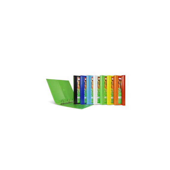 Raccoglitori personalizzabili in Stratopan (cartone interamente rivestito in PP) con meccanismi a 4 anelli a D. Dotati di tasche trasparenti sul 1° quadrante e sul dorso. Tasca interna. Inserimento facilitato della personalizzazione del dorso.