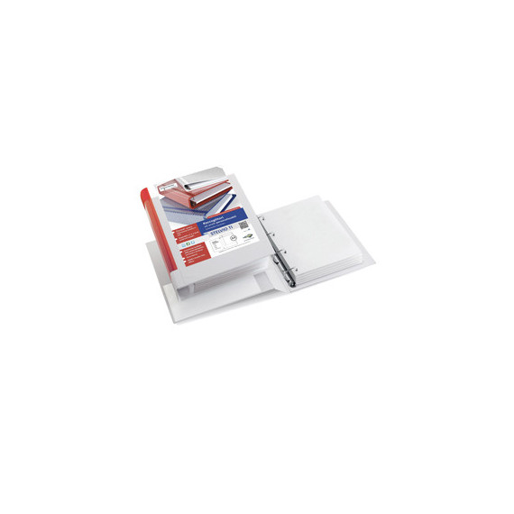 Raccoglitore personalizzabile in Colpan® (cartone rivestito in PVC) con tasca interna e meccanismo a 4 anelli (a D). Tasche trasparenti sul 1° quadrante e sul dorso che consentono l'inserimento facilitato della personalizzazione. Formato esterno: 260x310 mm. Formato contenuto: 220x300 mm (A4). Dorso: 40 mm. Diametro anelli: 30 mm. Colore bianco.