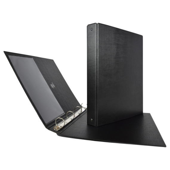 Raccoglitore in Colpan® (cartone rivestito in PVC) con meccanismo a 4 anelli tondi e tasca interna trasparente. Utili in ufficio, a scuola e a casa. Formato esterno: 255x310 mm. Formato contenuto: 220x300 mm (A4). Dorso: 25 mm. Diametro anelli: 16 mm. Colore nero.