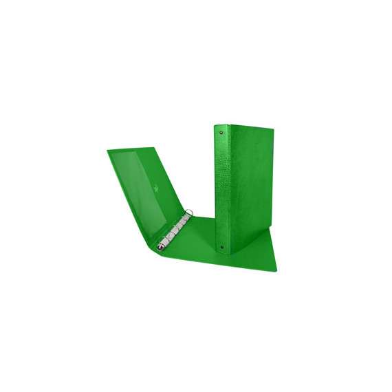Raccoglitore in Colpan® (cartone rivestito in PVC) con meccanismo a 4 anelli tondi e tasca interna trasparente. Utili in ufficio, a scuola e a casa. Formato esterno: 265x310 mm. Formato contenuto: 220x300 mm (A4). Dorso: 30 mm. Diametro anelli: 25 mm. Colore verde.