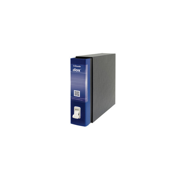 Registratore Dox® 2 dotato di linguella per l'estrazione a scomparsa 3 volte più resistente, caratterizzata da un design con presa più ergonomica, più agevole e arrotondata (l'area rientrante suggerisce il gesto per estrarre correttamente).Struttura in cartone rivestito con carta goffrata antimpronta e rifinito con paralati metallici alla base della plancia. Custodia in fibrone rivestito con carta nera goffrata trattata antimpronta, interno nero e parabordi verniciati. Meccanismo a leva in acciaio nichelato con pressino. Dorso in materiale plastico colorato e portaetichette trasparente con etichetta reversibile.Ogni dox possiede al suo interno un volantino con il codice QR da applicare sull'etichetta e 3 semplici indicazioni per scaricare la app dedicata su App Store e Google Play. Dox infatti si trasforma in registratore intelligente grazie a mydox app, la soluzione facile e immediata per archiviare e reperire documenti (tutte le informazioni sono disponibili sul sito www.myesseltedox.com).Formato protocollo (LxH) 23x34 cm. Dorso 8 cm. Colore blu. Dimensioni 85x352x288 mm.