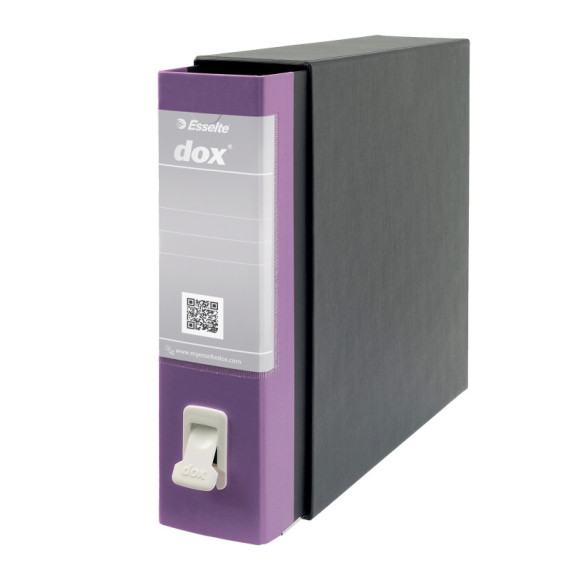 Registratore Dox® 2 dotato di linguella per l'estrazione a scomparsa 3 volte più resistente, caratterizzata da un design con presa più ergonomica, più agevole e arrotondata (l'area rientrante suggerisce il gesto per estrarre correttamente).Struttura in cartone rivestito con carta goffrata antimpronta e rifinito con paralati metallici alla base della plancia. Custodia in fibrone rivestito con carta nera goffrata trattata antimpronta, interno nero e parabordi verniciati. Meccanismo a leva in acciaio nichelato con pressino. Dorso in materiale plastico colorato e portaetichette trasparente con etichetta reversibile.Ogni dox possiede al suo interno un volantino con il codice QR da applicare sull'etichetta e 3 semplici indicazioni per scaricare la app dedicata su App Store e Google Play. Dox infatti si trasforma in registratore intelligente grazie a mydox app, la soluzione facile e immediata per archiviare e reperire documenti (tutte le informazioni sono disponibili sul sito www.myesseltedox.com).Formato protocollo (LxH) 23x34 cm. Dorso 8 cm. Colore lilla. Dimensioni 85x352x288 mm.
