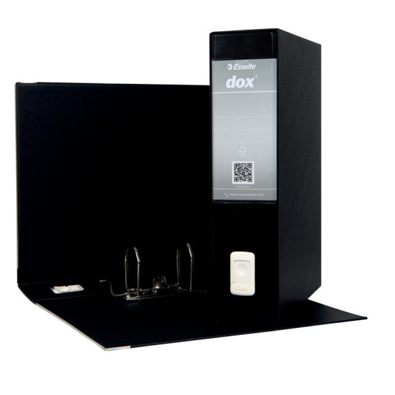 Registratore Dox® 2 dotato di linguella per l'estrazione a scomparsa 3 volte più resistente, caratterizzata da un design con presa più ergonomica, più agevole e arrotondata (l'area rientrante suggerisce il gesto per estrarre correttamente).Struttura in cartone rivestito con carta goffrata antimpronta e rifinito con paralati metallici alla base della plancia. Custodia in fibrone rivestito con carta nera goffrata trattata antimpronta, interno nero e parabordi verniciati. Meccanismo a leva in acciaio nichelato con pressino. Dorso in materiale plastico colorato e portaetichette trasparente con etichetta reversibile.Ogni dox possiede al suo interno un volantino con il codice QR da applicare sull'etichetta e 3 semplici indicazioni per scaricare la app dedicata su App Store e Google Play. Dox infatti si trasforma in registratore intelligente grazie a mydox app, la soluzione facile e immediata per archiviare e reperire documenti (tutte le informazioni sono disponibili sul sito www.myesseltedox.com).Formato protocollo (LxH) 23x34 cm. Dorso 8 cm. Colore nero. Dimensioni 85x352x288 mm.