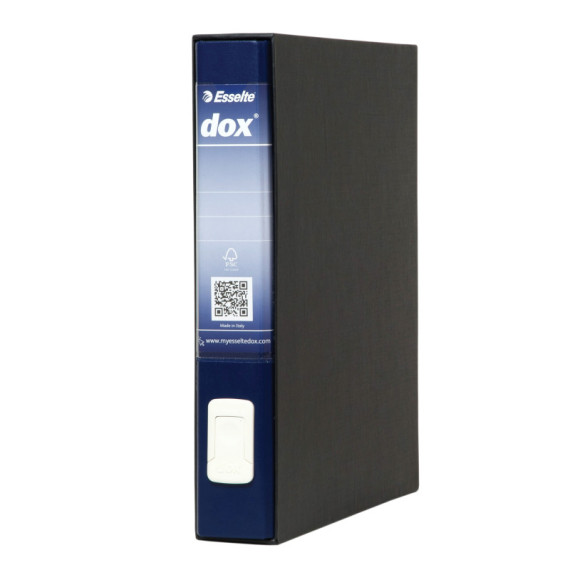 Nuovo registratore Dox® 4 dotato di linguella per l'estrazione a scomparsa 3 volte più resistente, caratterizzata da un design con presa più ergonomica, più agevole e arrotondata (l'area rientrante suggerisce il gesto per estrarre correttamente).Struttura in cartone rivestito con carta goffrata antimpronta e rifinito con paralati metallici alla base della plancia. Custodia in fibrone rivestito con carta nera goffrata trattata antimpronta, interno nero e parabordi verniciati. Meccanismo a leva in acciaio nichelato con pressino. Dorso in materiale plastico colorato e portaetichette trasparente con etichetta reversibile.Ogni dox possiede al suo interno un volantino con il codice QR da applicare sull'etichetta e 3 semplici indicazioni per scaricare la app dedicata su App Store e Google Play. Dox infatti si trasforma in registratore intelligente grazie a mydox app, la soluzione facile e immediata per archiviare e reperire documenti (tutte le informazioni sono disponibili sul sito www.myesseltedox.com).Formato commerciale (LxH) 23x29.7 cm. Dorso 5 cm. Colore blu. Dimensioni 59x315x288 mm.