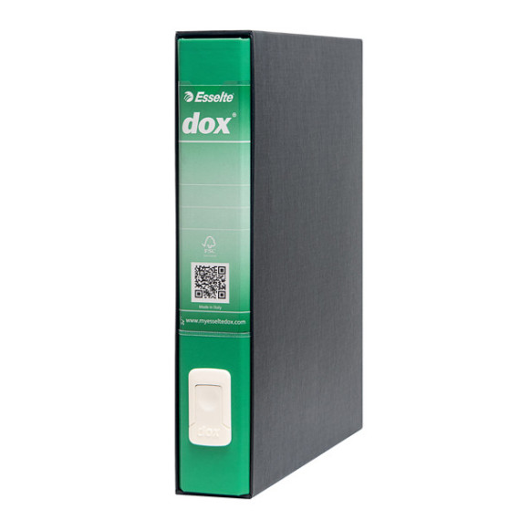 Nuovo registratore Dox® 4 dotato di linguella per l'estrazione a scomparsa 3 volte più resistente, caratterizzata da un design con presa più ergonomica, più agevole e arrotondata (l'area rientrante suggerisce il gesto per estrarre correttamente).Struttura in cartone rivestito con carta goffrata antimpronta e rifinito con paralati metallici alla base della plancia. Custodia in fibrone rivestito con carta nera goffrata trattata antimpronta, interno nero e parabordi verniciati. Meccanismo a leva in acciaio nichelato con pressino. Dorso in materiale plastico colorato e portaetichette trasparente con etichetta reversibile.Ogni dox possiede al suo interno un volantino con il codice QR da applicare sull'etichetta e 3 semplici indicazioni per scaricare la app dedicata su App Store e Google Play. Dox infatti si trasforma in registratore intelligente grazie a mydox app, la soluzione facile e immediata per archiviare e reperire documenti (tutte le informazioni sono disponibili sul sito www.myesseltedox.com).Formato commerciale (LxH) 23x29.7 cm. Dorso 5 cm. Colore verde. Dimensioni 59x315x288 mm.