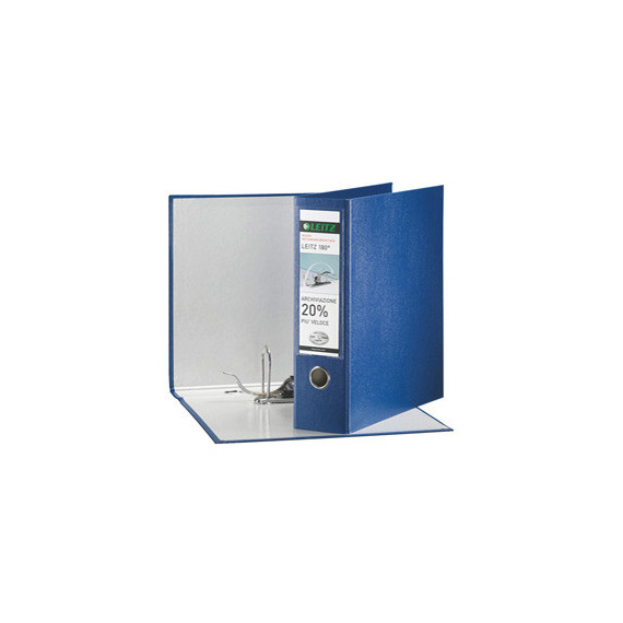 Registratore in plastica con meccanismo brevettato Leitz 180° che rende più facili e rapide le pratiche di archiviazione ed estrazione dei documenti. Rispetto ad un registratore tradizionale, l'apertura del meccanismo risulta infatti più ampia del 50% così che lo svolgimento di tali attività possa essere più veloce del 20%.L’apertura della leva a 180° permette inoltre l’archiviazione dei fogli da entrambi i lati, evitando di dover richiudere il meccanismo per poi riaprirlo ogni volta che si deve inserire un documento nella parte sinistra del registratore.Realizzato in robusto cartone da 2,4 mm, con rivestimento esterno in polipropilene (finitura similpelle) e carta interna plastificata (effetto perlato). Custodia rivestita in carta goffrata con grafica bicromatica.Formato Protocollo (LxH) 23x33 cm. Dorso 8 cm. Colore blu. Dimensioni 85x350x295 mm.