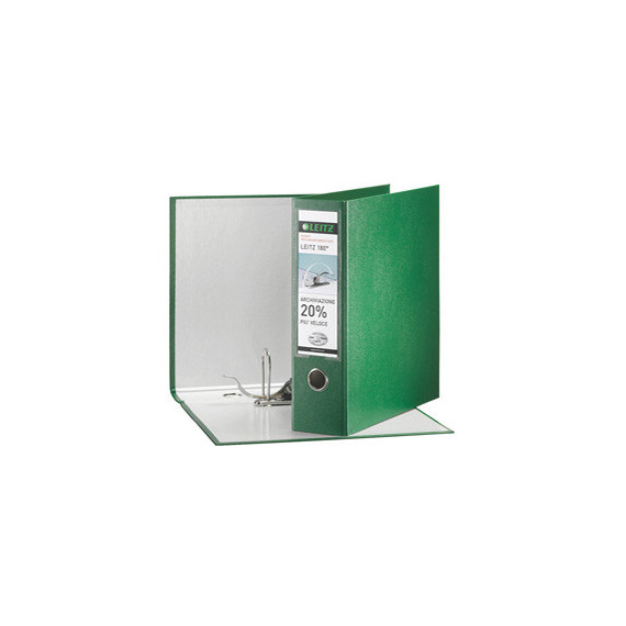 Registratore in plastica con meccanismo brevettato Leitz 180° che rende più facili e rapide le pratiche di archiviazione ed estrazione dei documenti. Rispetto ad un registratore tradizionale, l'apertura del meccanismo risulta infatti più ampia del 50% così che lo svolgimento di tali attività possa essere più veloce del 20%.L’apertura della leva a 180° permette inoltre l’archiviazione dei fogli da entrambi i lati, evitando di dover richiudere il meccanismo per poi riaprirlo ogni volta che si deve inserire un documento nella parte sinistra del registratore.Realizzato in robusto cartone da 2,4 mm, con rivestimento esterno in polipropilene (finitura similpelle) e carta interna plastificata (effetto perlato). Custodia rivestita in carta goffrata con grafica bicromatica.Formato Protocollo (LxH) 23x33 cm. Dorso 8 cm. Colore verde. Dimensioni 85x350x295 mm.