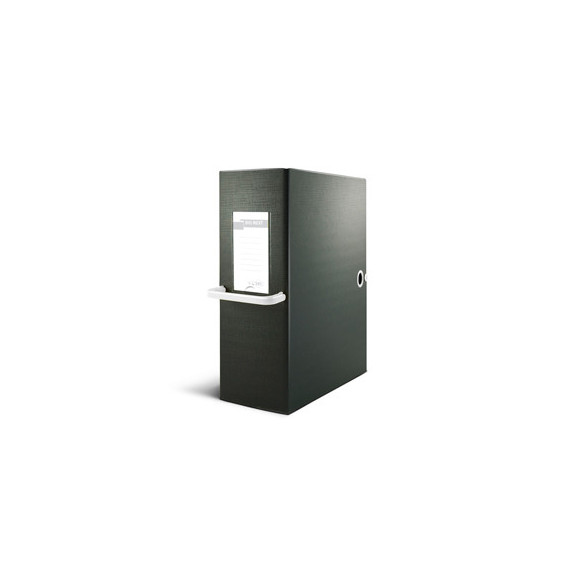 Cartelle in Colpan® nero (cartone rivestito in PVC) con chiusura a tre lembi. Maniglia in plastica bianca. Occhiello e bottoni automatici in metallo nel colore della maniglia. Etichetta intercambiabile colorata. Adatte per l'archiviazione e il trasporto di progetti, disegni, documenti e cartelline. Formato esterno: 260x360mm. Formato contenuto:250x350mm. Dorso 12cm.