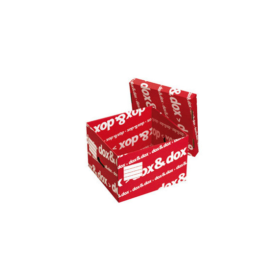 Robusta scatola a doppio strato di cartone su tutti i lati e triplo fondo. Può contenere 2 scatole archivio dox&dox. F.to utile LxHxP 395x280x355mm