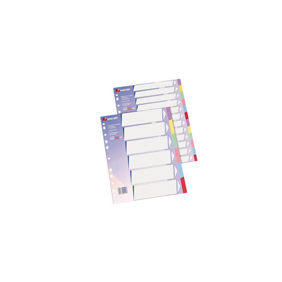 Separatori in cartoncino Manilla da 225 gr colorati in pasta (certificazioni ecologiche: well managed forest, elemental chlorine free, ph neutral, long life ISO 9706, heavy metal absence-CE). Dotati di 12 tasti neutri scrivibili e di indice frontale prestampato. Foratura universale. Formato: 21x29,7 cm (A4).