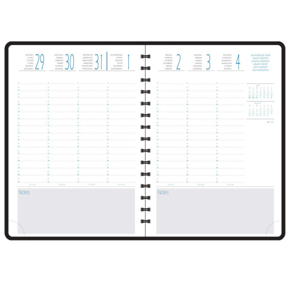 Agenda settimanale, una settimana su due pagine. 16 mesi da agosto a dicembre. Rilegatura a spirale. Carta bianca, stampa bicolore, Tasca trasparente portatelefono, tasca portadocumenti, biglietti da visita, scontrini. Dotato di portapenne e blocco 64 pagine. Versione multilingue.