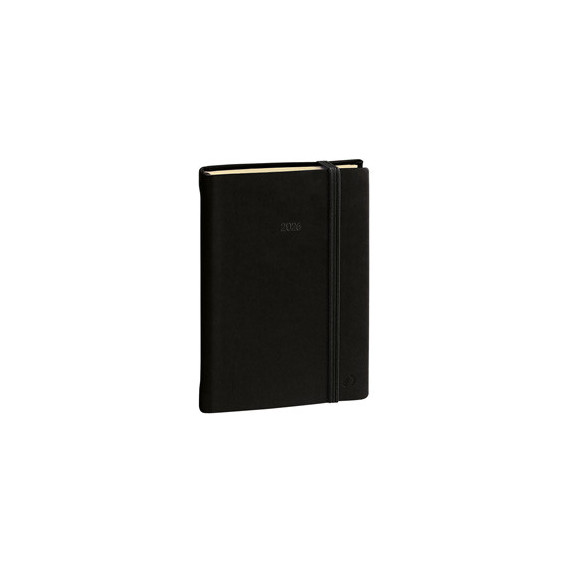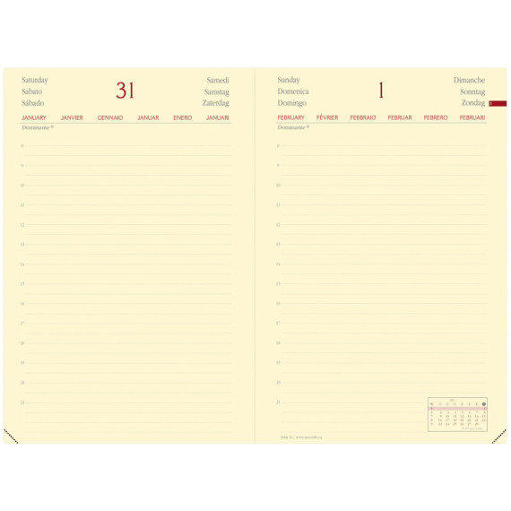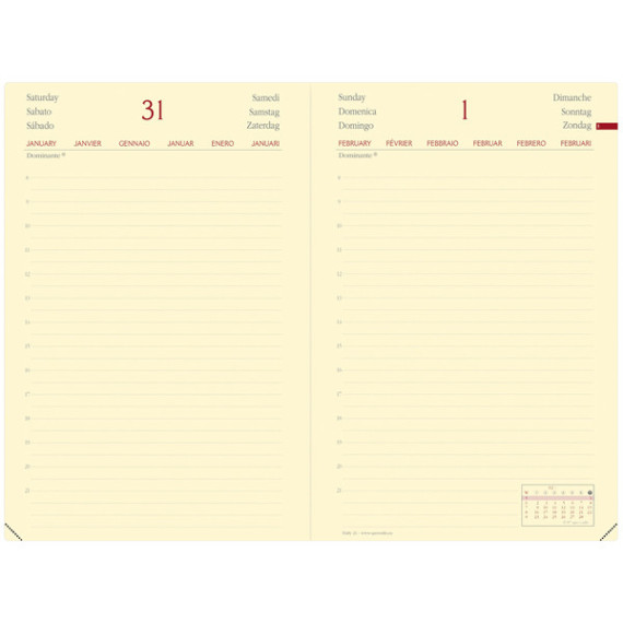 Agenda giornaliera tascabile, un giorno per pagina. 12 mesi da gennaio a dicembre, schema multilingue e pagine note intercambiabili, tasca con soffietto portabiglietti. Carta color avorio certificata PEFC stampa bicolore, rilegatura cucita e chiusura con elastico.