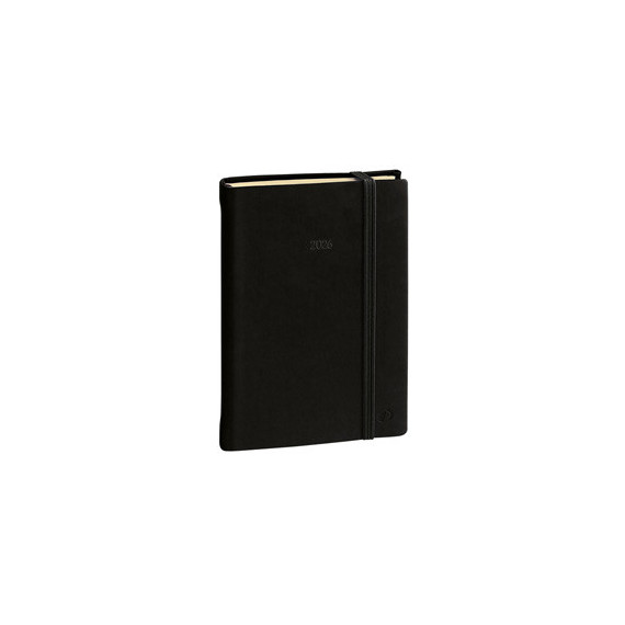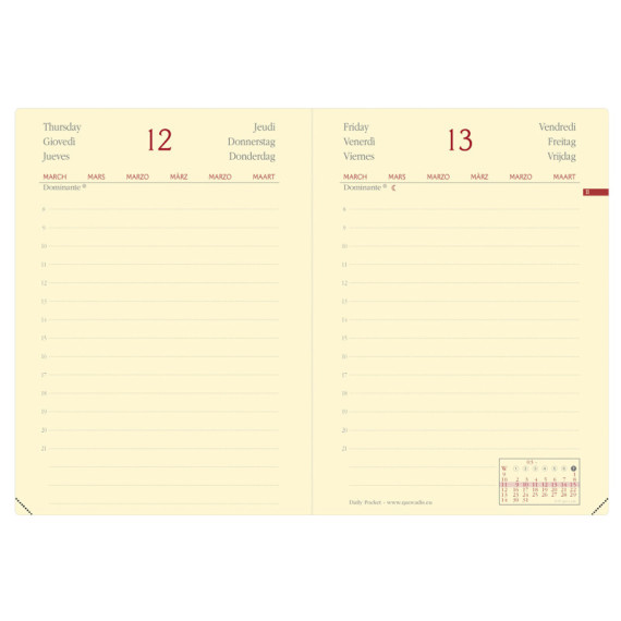 Agenda giornaliera tascabile, un giorno per pagina. 12 mesi da gennaio a dicembre, schema multilingue e pagine note intercambiabili, tasca con soffietto portabiglietti. Carta color avorio certificata PEFC stampa bicolore, rilegatura cucita e chiusura con elastico.