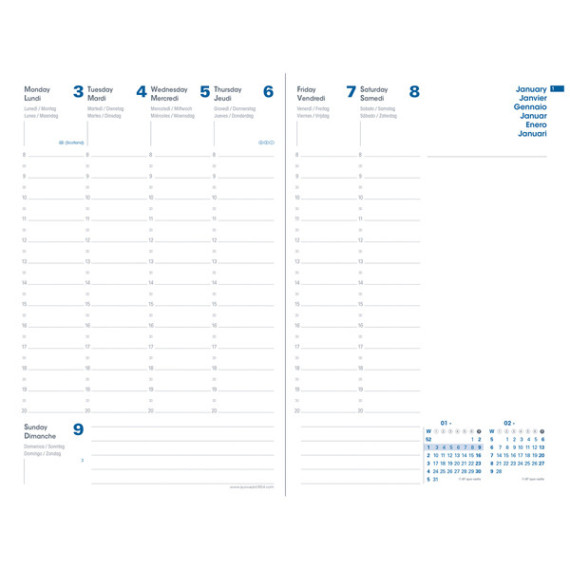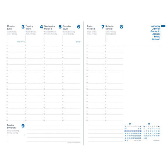 Agenda settimanale da ufficio, una settimana su due pagine. 13 mesi da dicembre a dicembre. Rubrica amovibile, carta 100% riciclata, certificata Blue Angel, stampa bicolore 100% inchiostro a base vegetale, rilegatura cucita. Copertina senza pftalati. Edizione multilinque.