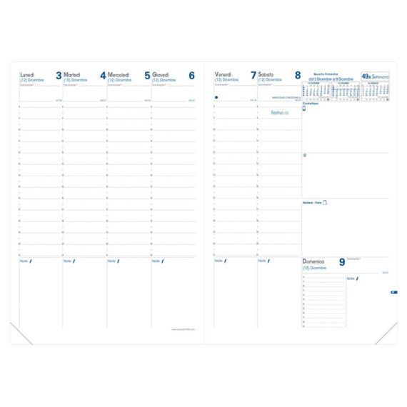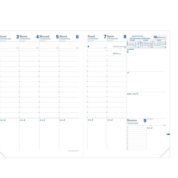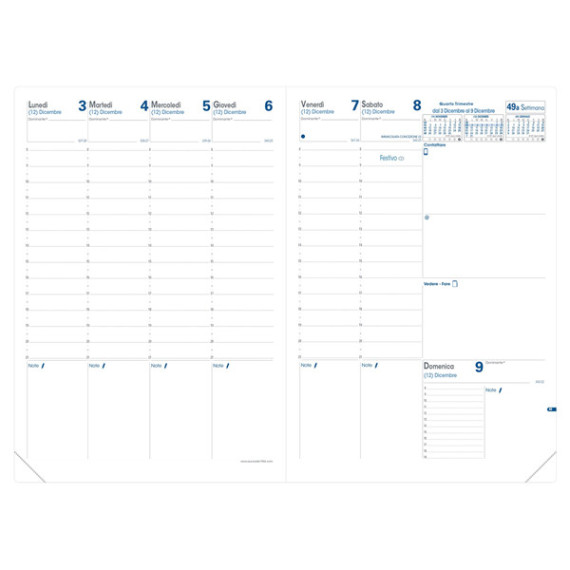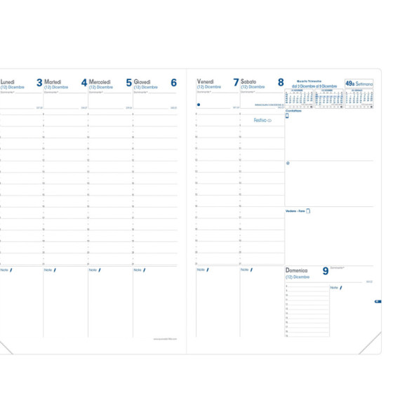 Agenda settimanale da ufficio, una settimana su due pagine con annotazioni giornaliere. 13 mesi da dicembre a dicembre. Carta bianca certificata PEFC stampa bicolore, rilegatura cucita. Edizione italiana.