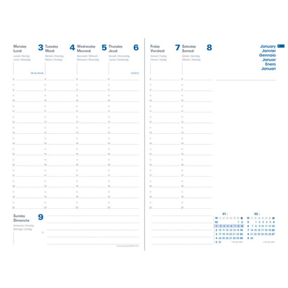 Articolo in prenotazione, in consegna a partire dal mese di luglio 2025.Agenda settimanale da ufficio, una settimana su due pagine. 13 mesi da dicembre a dicembre, rubrica intercambiabile. Carta 100% riciclata certificata Blue Angel, stampa bicolore 100% inchiostro vegetale. Copertina senza ftalati con nuovo marchio scavato elegante.