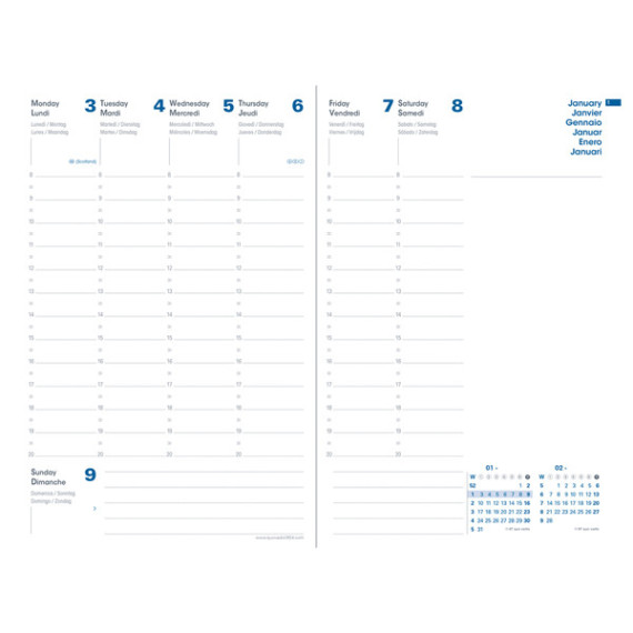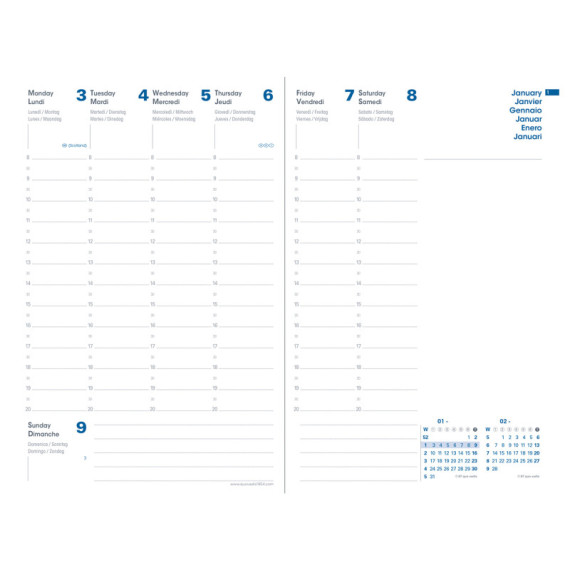 Agenda settimanale da ufficio, una settimana su due pagine. 13 mesi da dicembre a dicembre, rubrica intercambiabile. Carta 100% riciclata certificata Blue Angel, stampa bicolore 100% inchiostro vegetale. Copertina senza ftalati con nuovo marchio scavato elegante.