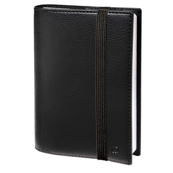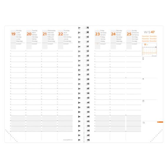 Agenda settimanale da ufficio rilegatura con spirale. Una settimana su due pagine. 13 mesi da dicembre a dicembre, rubrica amovibile, 32 pagine di appunti riposizionabili, anno-Planing pieghevole. Rivestimento in grana effetto pelle, chiusura con elastico verticale e cucitura a sellaio tono su tono. Carta bianca certificata PEFC, stampa in quadricromia. Edizione multilingue.