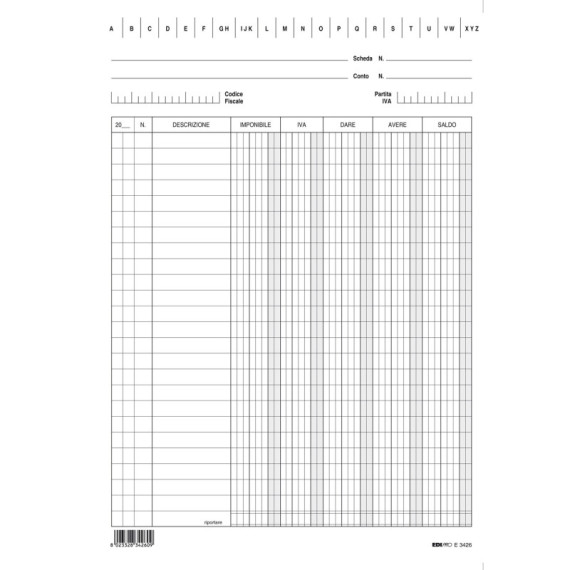 100 schede in cartoncino da 170gr. Formato 24x17cm verticale. Dare/avere/saldo.