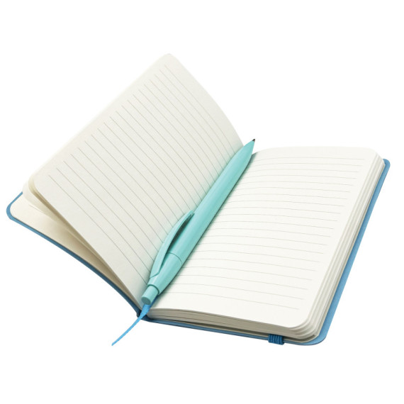 Taccuino con copertina morbida e tasca interna a soffietto. Dotato di elastico esterno e segnapagina coordinato al colore della copertina. Carta avoriata rigata da 70gr. 5 colori assortiti: nero, giallo, verde chiaro, fucsia e celeste. Confezionato singolarmente in cellophane.
